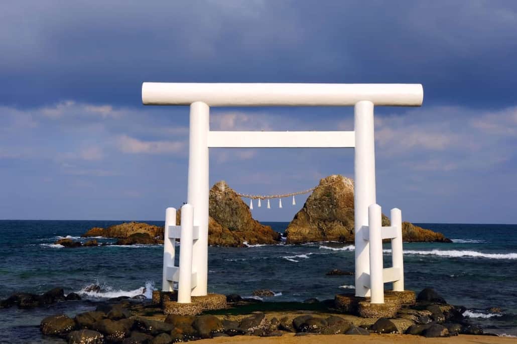 • Sakurai Shrine (Itoshima, Fukuoka): A white torii standing near the “couple rocks”, 2 large rocks joined by a Shinto rope feature scenic sunset views.