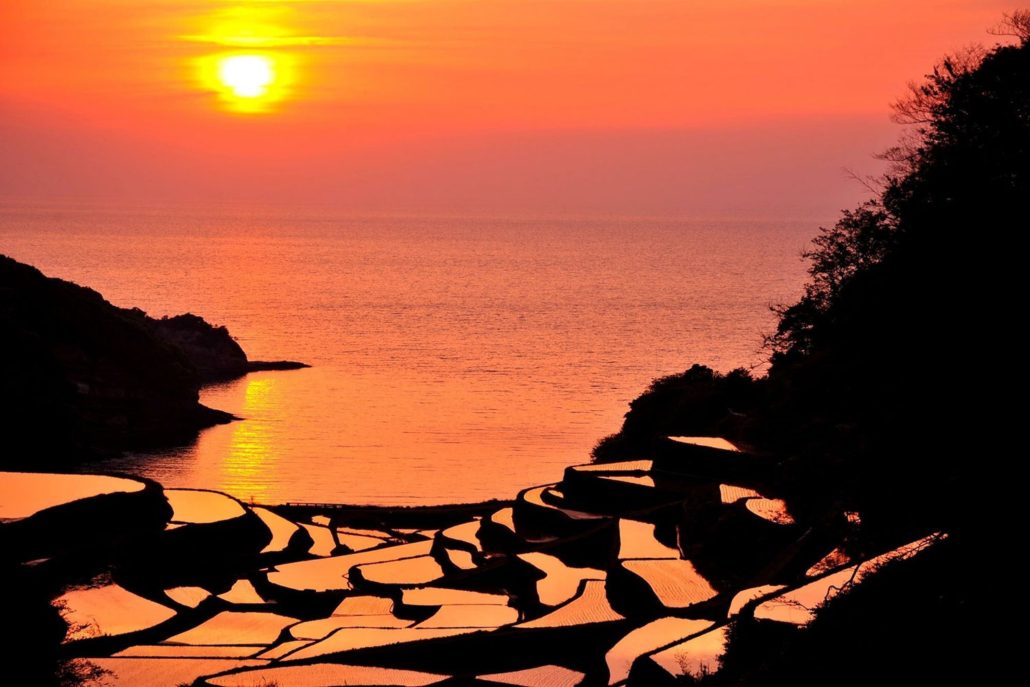 Hamanoura Senmaida, Saga – The best time to visit it is definitely at sunset time when the rice fields are tinted with the sun goes down over the ocean.