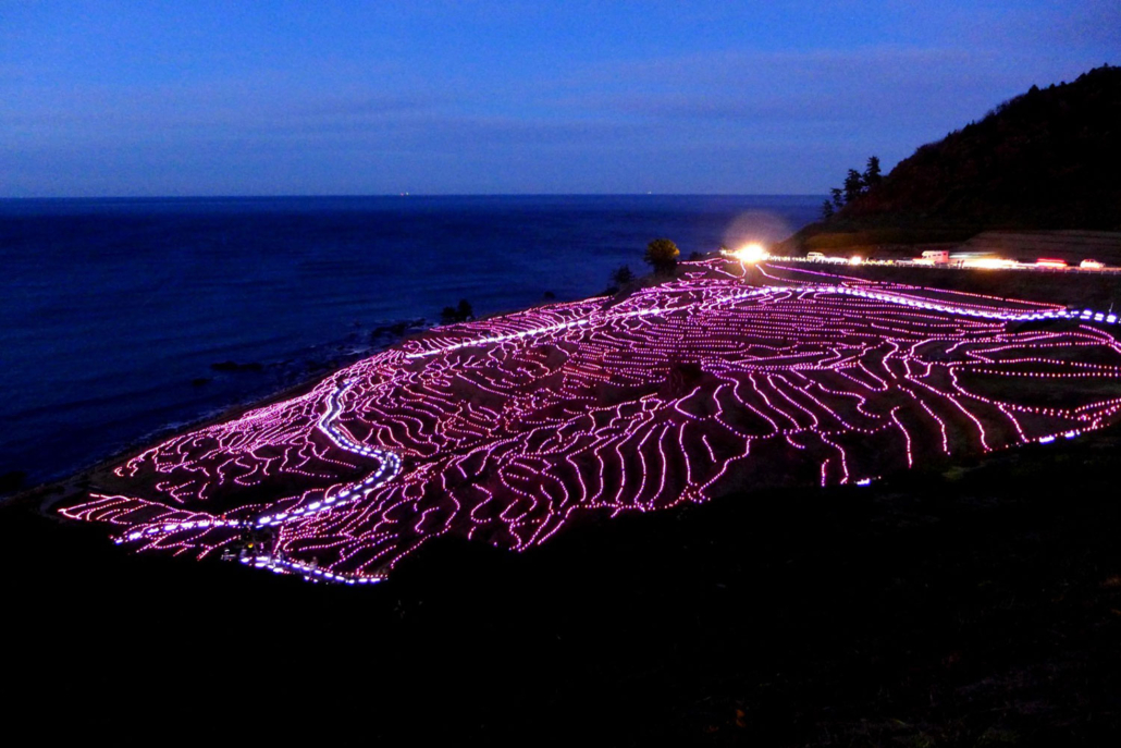 Shiroyone Senmaida, Ishikawa – During the annual light-up festival Aze no Kirameki (Oct. to Mar.), when the slope that faces the sea are illuminated using 25,000 solar-powered LEDs that can be seen up close when walking on the pathway—they will be open to the public for five hours.