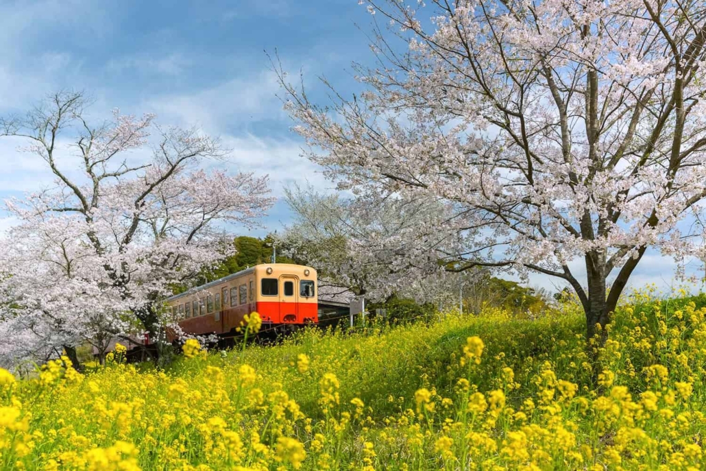 Another railway, well known for its cherrrry blossoms and nanohana flowers. The Kominato Line is a rural railway over a 40-kilometer stretch with view of nanohana fields and cherry blossoms ubiquitous in the spring, surrounded by small mountains.